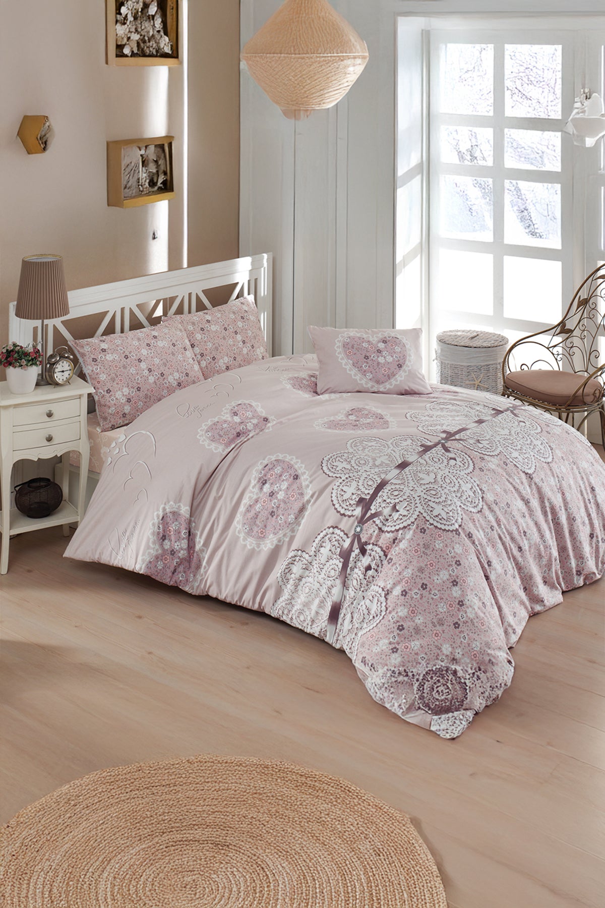 Set lenjerie de pat, DemoHome DEPPO, dublu king size din 100% bumbac ranforce cu model de INIMA DE DANTELA, ROZ acasa - cearcaf plic, cearceaf pat, 2 fete de perna