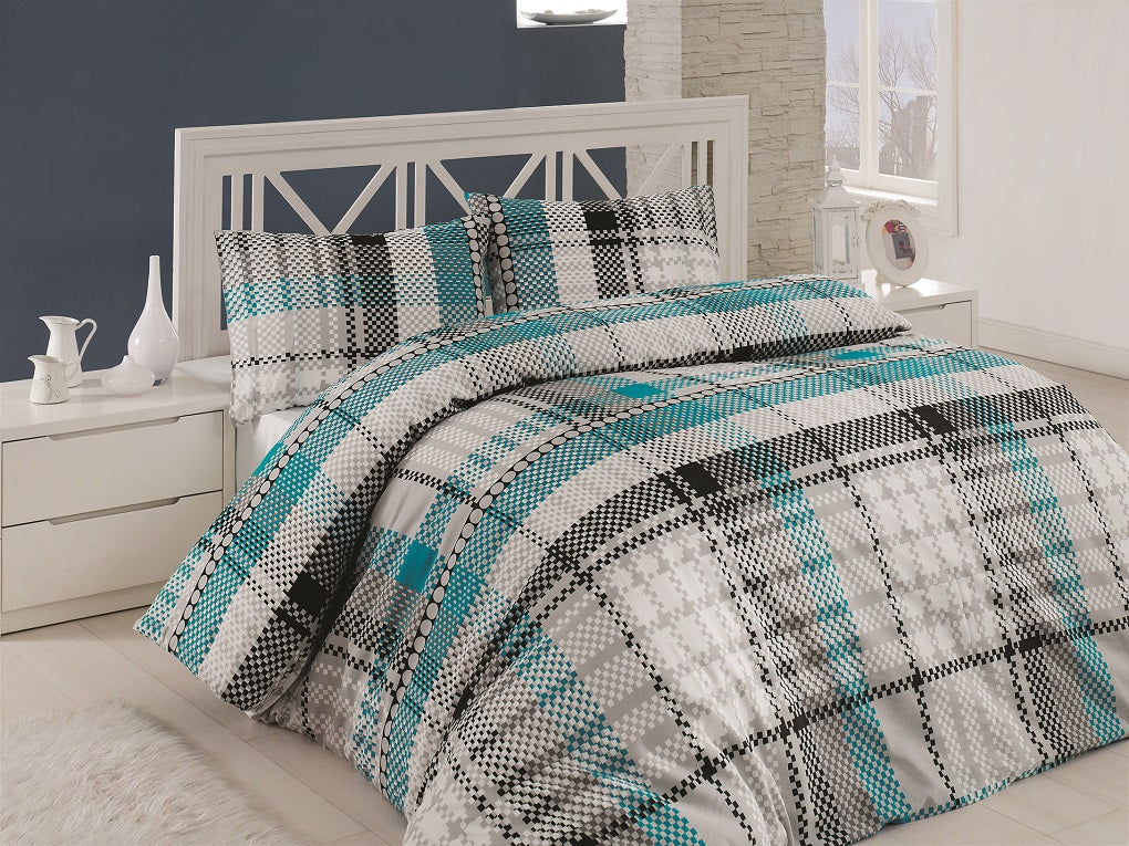 Set lenjerie de pat, DemoHome DEPPO, dublu king size din bumbac satinat (polycotton) cu model de CAROURI VERZI, ALB acasa – cearceaf plic, cearceaf pat, 2 fete de perna